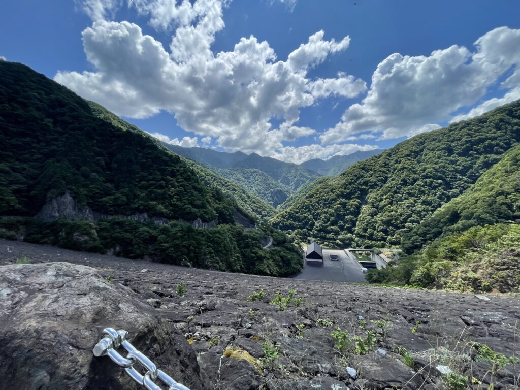 ダムの上を歩いてみると、片側には徳山湖の大きな水面、反対側には深い谷が広がり、まるで天空の道を歩いているようでした。